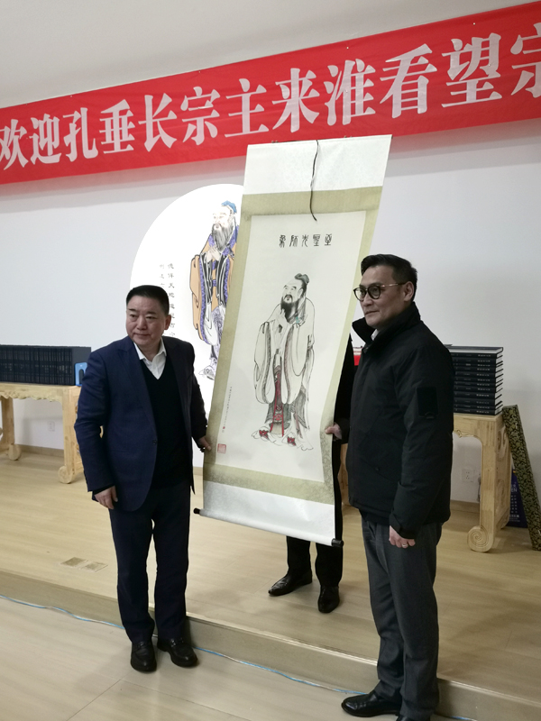 孔垂长会长向孔令发董事长赠送《至圣先师象》
